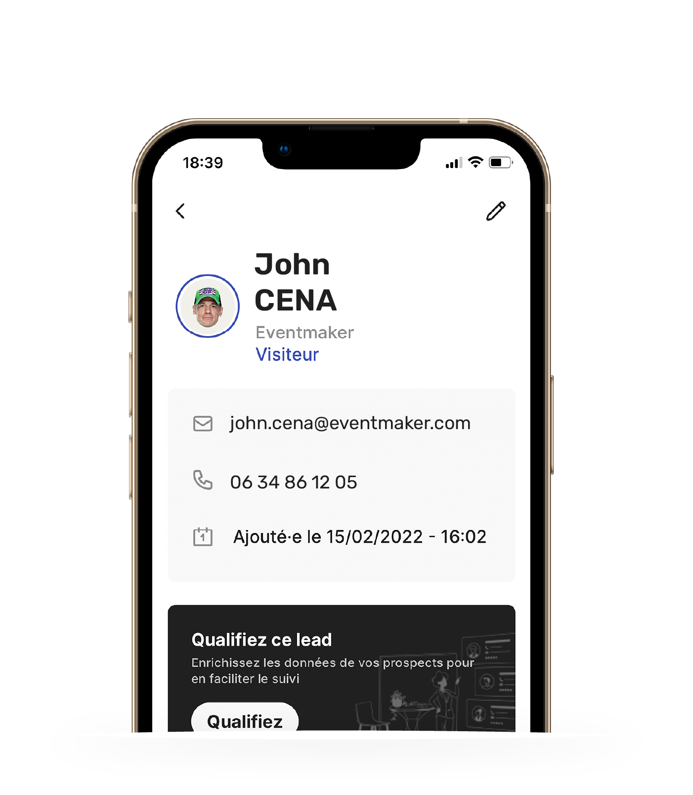 Avec notre application, vous n'avez qu'à scanner le badge pour enregistrer le contact et toutes les informations que vous donnera l'organisateur